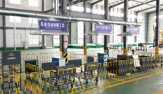 报废车在此工位上完成车身活动部件拆解,对车辆的前挡风玻璃、后挡风玻璃以及车门前后机盖进行全方位拆解。